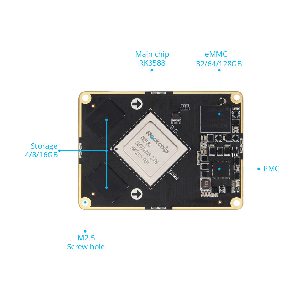 Pääpiiri: RK3588 (neliytiminen A76 + neliytiminen A55, Mali-G610, 6TOPS Computing Power) BTB johtaa 400 nastaan, 0,5 mm: n etäisyyteen, johtaa kaikkiin I0: een
